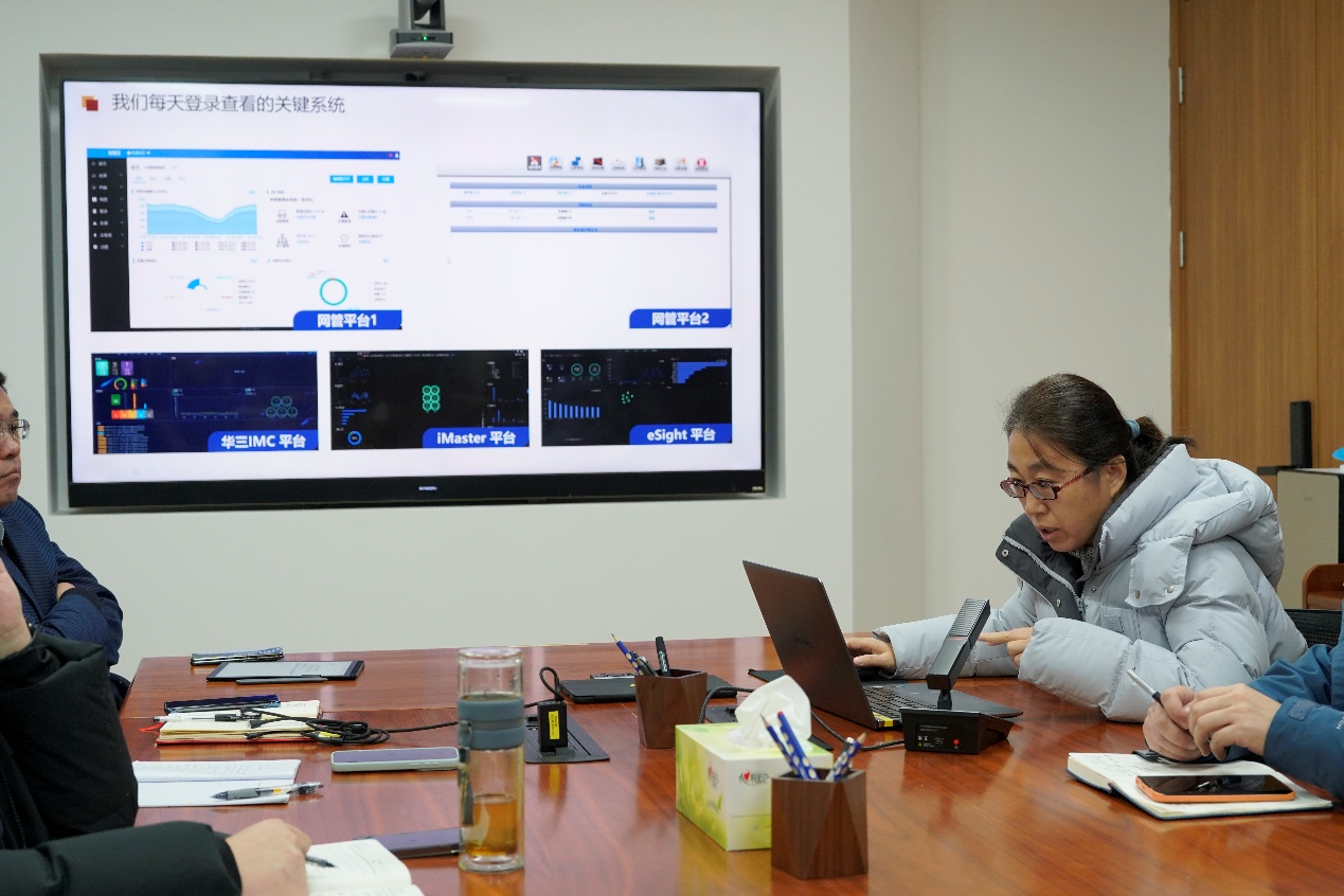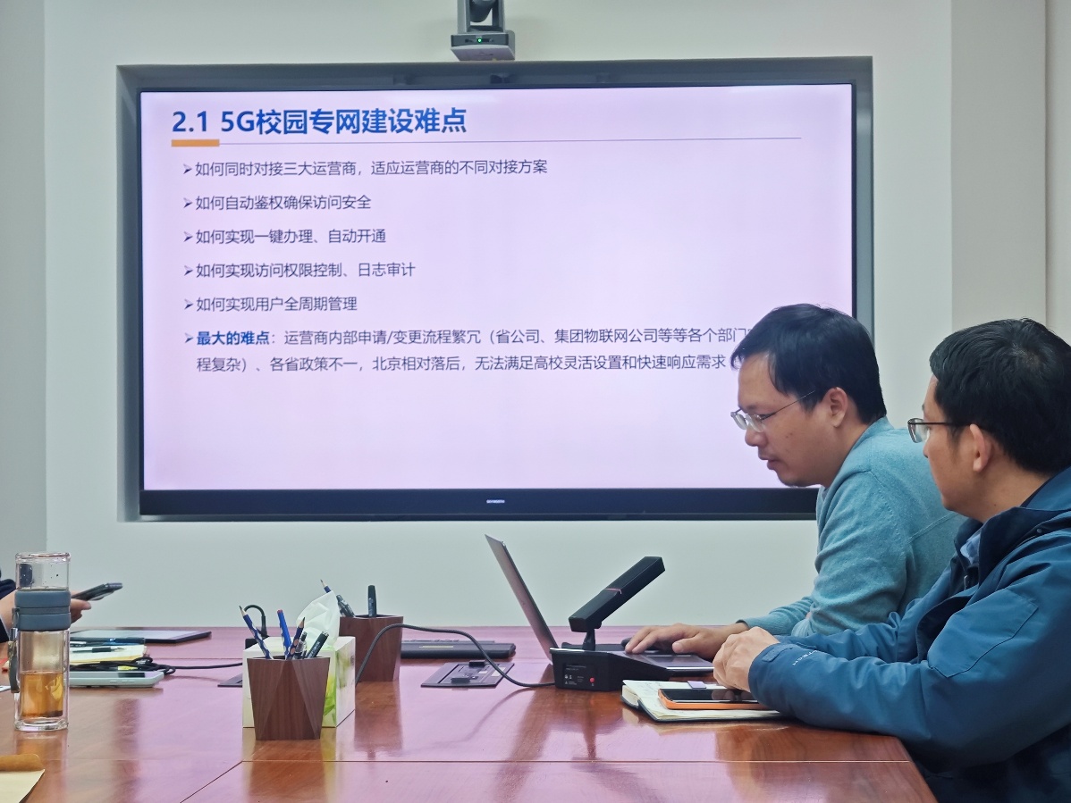 田小萍以“基于AI的校园网络智能运维实践探索”为题,分享了我校在网络运维智能化转型中的自主研发历程。她从日常运维工作、基础运维数据治理、智能问数等方面,展示了AI+网络运维在提升稳定性与运维效率方面的实际应用成果。王兴建以“全国漫游、无感直连校园网”为题,介绍了5G校园专网的建设实践,重点阐述了如何突破5G融合网络技术的建设难点和突破点,实现师生在校外随时随地无感知接入校园网。与会人员围绕分享内容展开热烈讨论,交流实践经验,碰撞思想火花,充分展现了中心同志积极思考、勇于创新的良好风貌。